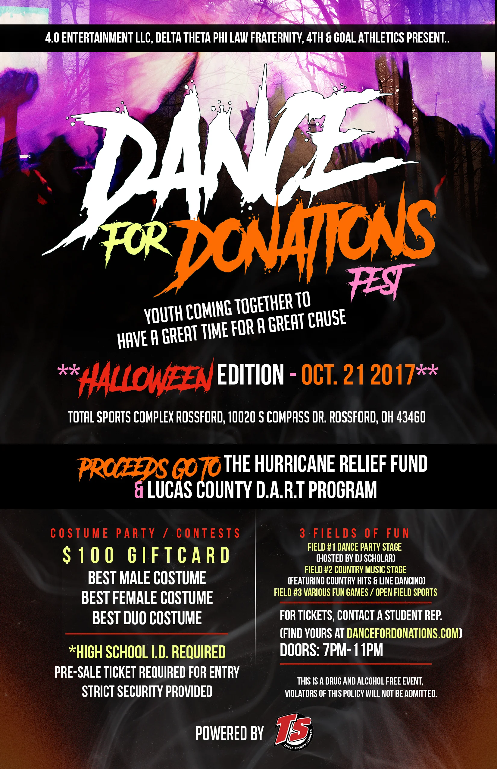 For the next Dance For Donations event, proceeds will be going to the Hurricane Irma Relief Fund and Lucas County D.A.R.T (Drug Abuse Response Team), which guides drug overdose victims and their families on their long-term recovery! This event is hosted by 4.0 Entertainment LLC, Delta Theta Phi Law Fraternity, and 4th & Goal Football. Chaperones will be provided by members of the Law School Fraternity and the community. Security will be provided by volunteer deputy sheriffs and parent volunteers. The next event will be held at the beautiful Total Sports Athletic Complex in Rossford, OH.